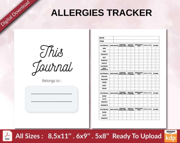 Stay on top of your allergies with our tracker! This log book is perfect for anyone who wants to keep track of their allergy symptoms and triggers. With 120 pages of ready-to-upload PDF for KDP, this log book is available in 6×9, 8.5×11, and 5×8 sizes for low content planner or log book. It’s perfect for personal use or for commercial use.